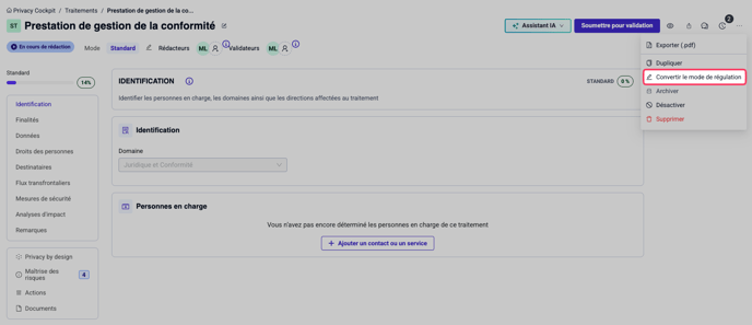 Entities that have created custom compliance modes can now convert their existing processing activities to these new regulation modes. When converting, the processing activity will automatically adapt to the new fields defined in the target mode.