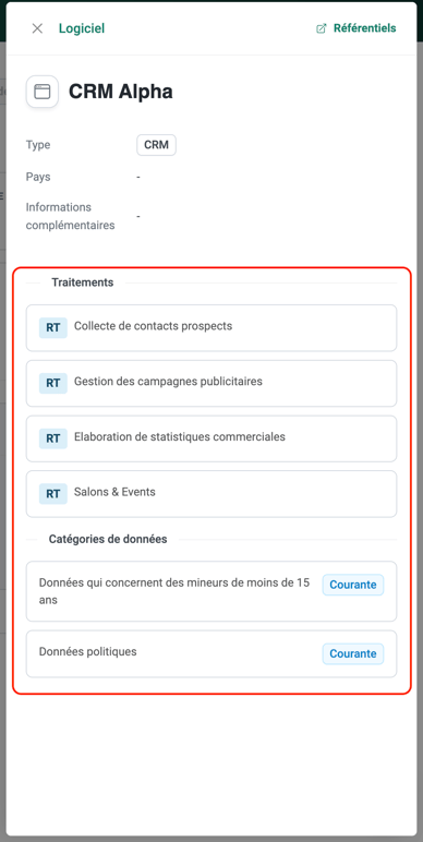 Nous avons également enrichi les différentes fenêtres de consultation avec l'affichage des éléments liés à l'objet consulté. Vous pouvez ainsi retrouver tous les traitements liés à un même logiciel, ainsi que les catégories de données qui y sont attachées. Cette fonctionnalité a été déployée pour tous les éléments du référentiel associés aux traitements.
